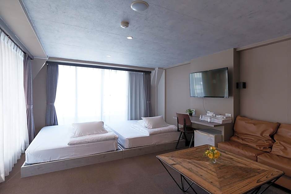 The family room includes a private bathroom, well-fitted with a bath, a shower, a bidet, a hairdryer and slippers. The family room features air conditioning, tatami, a dining area, a carpeted floor, as well as a flat-screen TV. The unit has 6 futons.